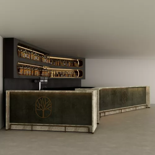 This custom-designed bar showcases a modern, linear layout with a refined stone-effect finish and illuminated shelving. The front counter is highlighted with a decorative emblem, creating a strong visual identity for the space. Behind the bar, floating shelves with integrated lighting provide an elegant display for bottles, combining functionality with striking aesthetics. Ideal for contemporary hospitality concepts, this bar design blends durability, sophistication, and brand character.