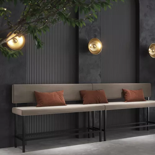 Bancheta Arthur este o banchetă înaltă de tip diner, cu cadru metalic, ideală pentru spații HoReCa. Este disponibilă în diverse culori și finisaje, personalizabilă conform dimensiunilor dorite. Bancheta modulară poate fi realizată într-o gamă largă de materiale textile și piele artificială. Adâncimea șezutului: 39 cm. Prețul este pe metru.