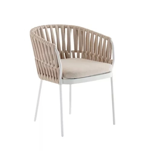 Boho este un scaun de exterior cu cotiere, foarte stabil și rezistent, cu cadru din aluminiu și împletit cu frânghie acrilică. Include pernă tapițată cu stofă Olefin. Este stivuibil și perfect pentru orice terasă HoReCa.