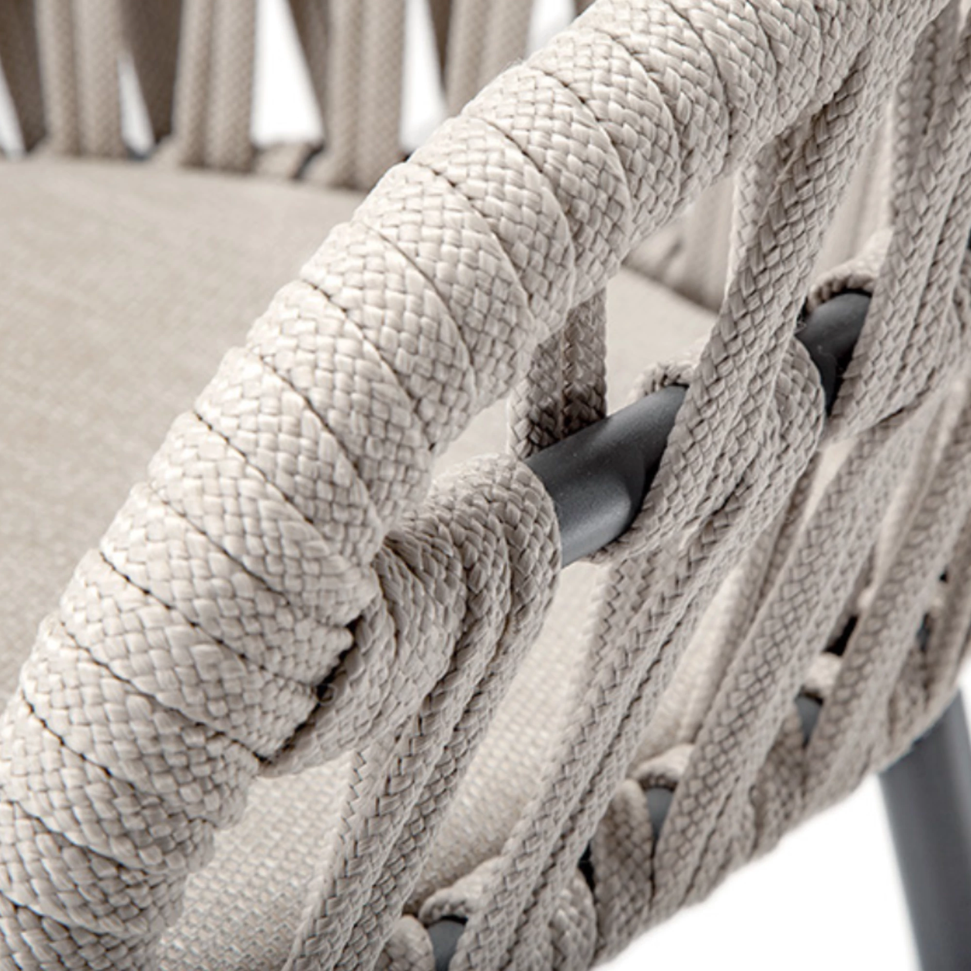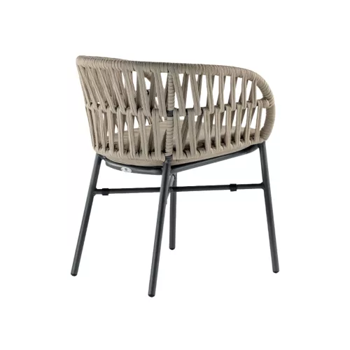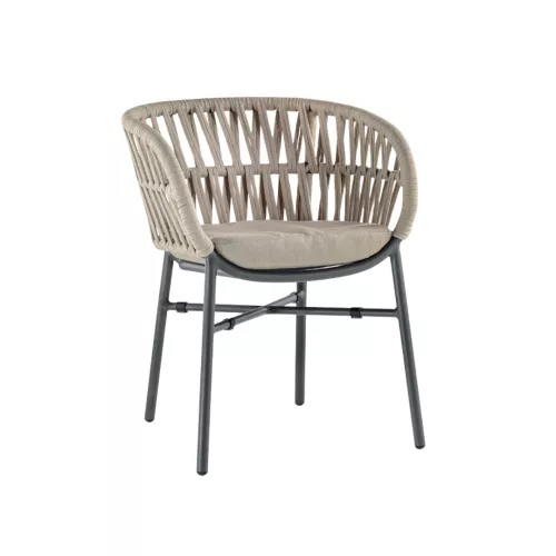 Scaunul de exterior Breeze aduce eleganță și rezistență pe orice terasă HORECA. Are cadru din aluminiu, spătar și cotiere împletite cu sfoară din poliolefină și pernă confortabilă din Textylene. Este disponibil în mai multe culori, potrivit oricărui decor exterior.