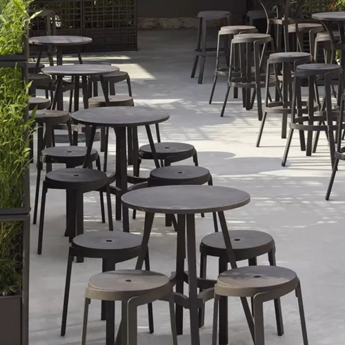 Combo 70 este o masă de exterior versatilă, ideală pentru terasele horeca. Cu coloană centrală și 4 picioare, este realizată din rășină polipropilenică din fibră de sticlă regenerată, cu aditivi UV. Disponibilă cu blat rotund de 70 sau 60 cm, în finisaj mat.
