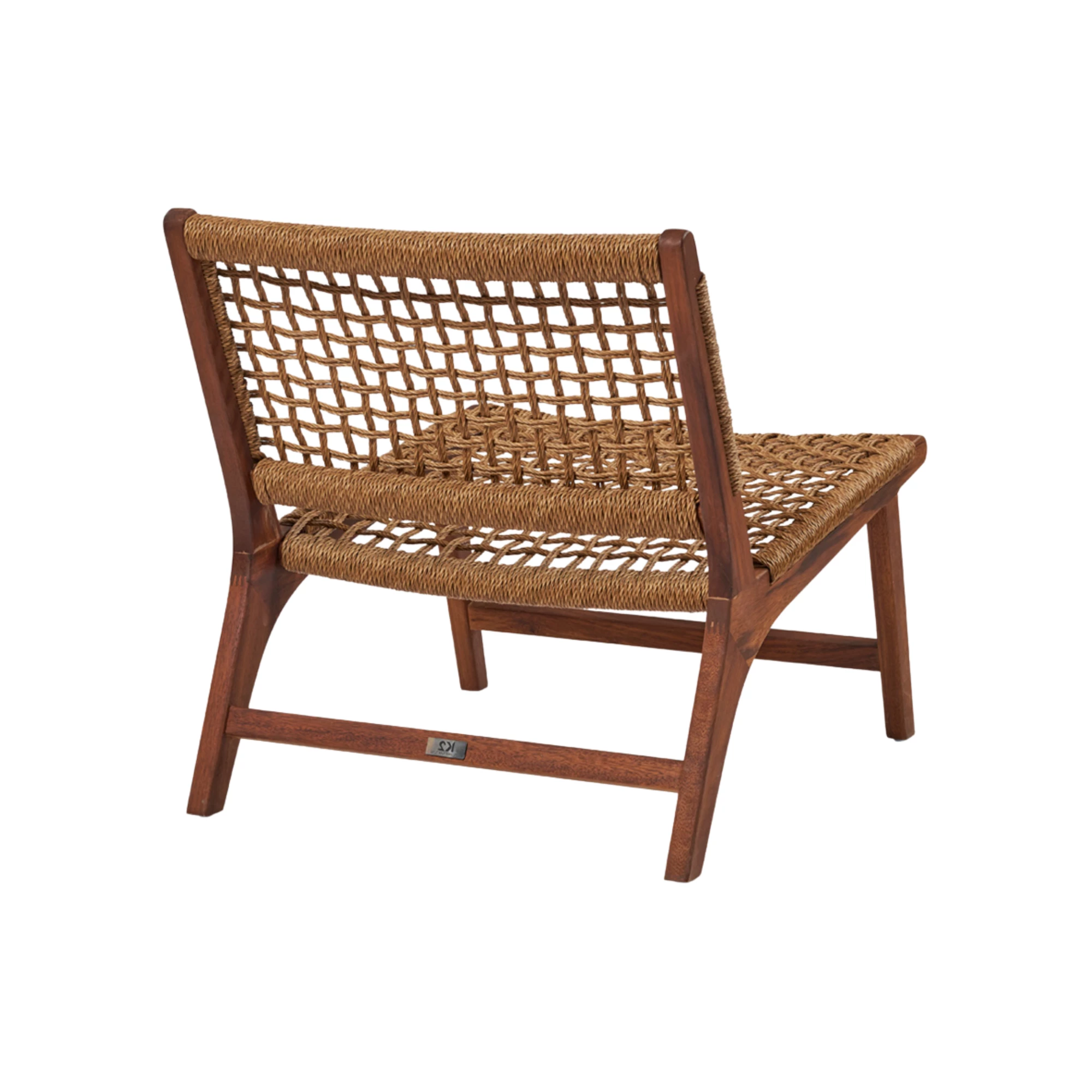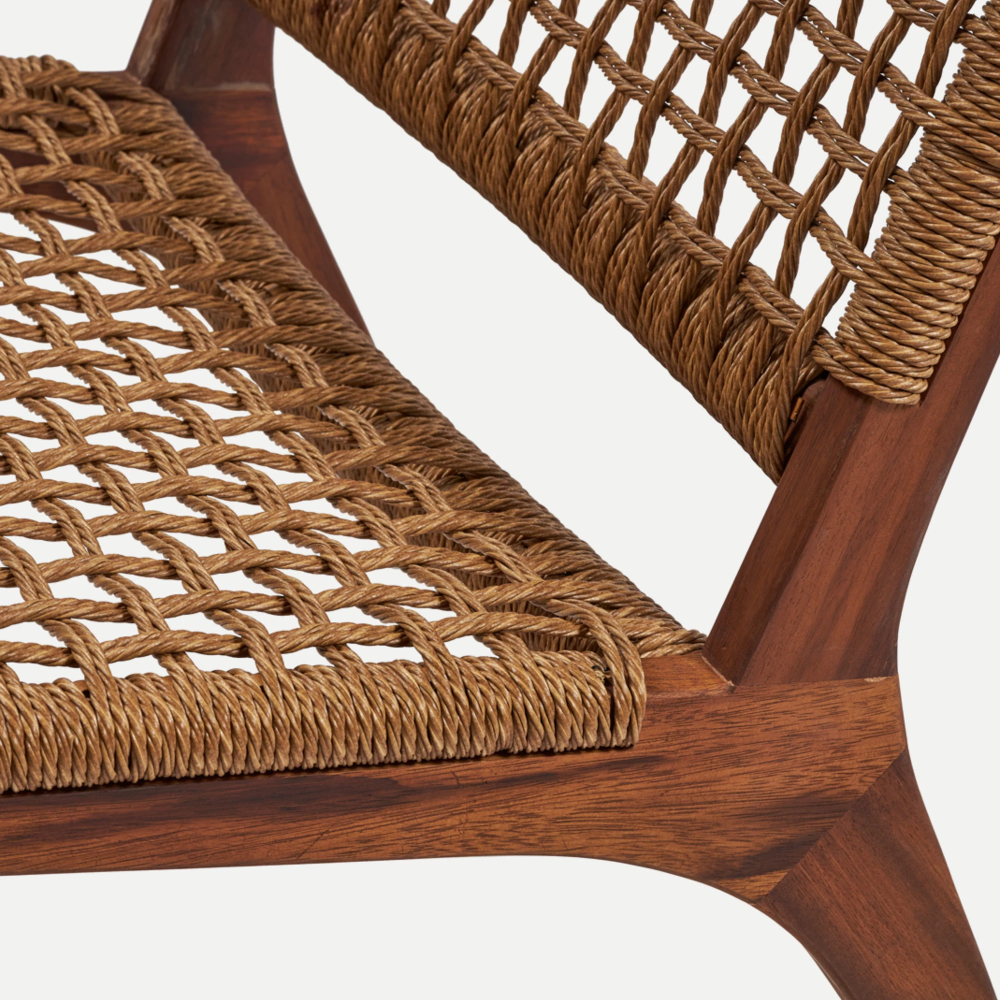 Scaun de exterior realizat din lemn de tec durabil, cu șezut împletit din ratan. Potrivit pentru terase, grădini și spații horeca în aer liber.