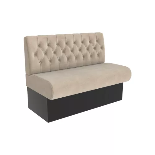 Donald Bench Capitons Foldings este o banchetă tapițată elegantă, cu capitonaje și pliuri rafinate pe spătar, inspirate din stilul Chesterfield. Dispune de arcuri nosag și spumă de înaltă densitate, oferind confort și durabilitate. Disponibilă într-o gamă variată de textile profesionale, este ideală pentru spații HORECA elegante.