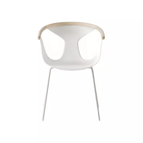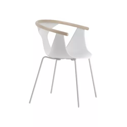 Carcasă din polipropilenă întărită cu fibră de sticlă, antistatică, rezistentă la UV, spătar curbat din lemn masiv de frasin și picioare din oțel Ø14 mm.