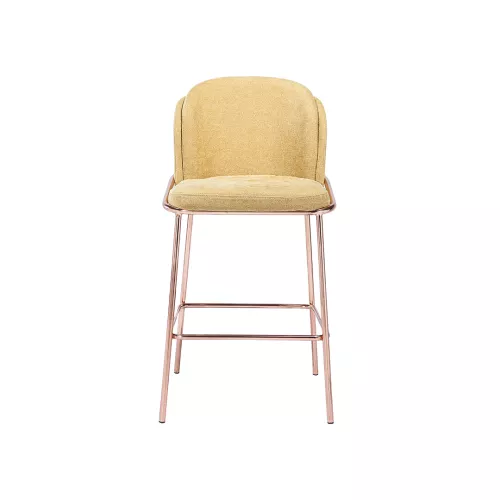 Jim BK 005 B este un scaun de bar rafinat, cu cadru metalic auriu, șezut și spătar tapițate. Disponibil într-o gamă variată de materiale profesionale, permite personalizare completă. Designul modern și structura solidă îl fac potrivit pentru locații HoReCa intens circulate.
