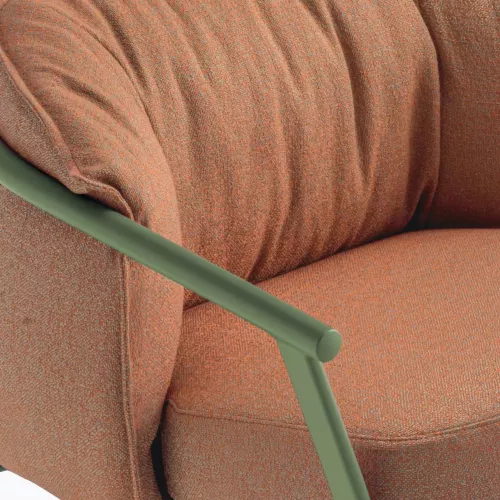 Perna amplă din spumă poliuretanică injectată se așază delicat pe benzi elastice, oferind un confort superior și o rezistență de durată. Husele pentru șezut și spătar sunt detașabile și unite printr-un fermoar discret, pentru o întreținere ușoară și rapidă.