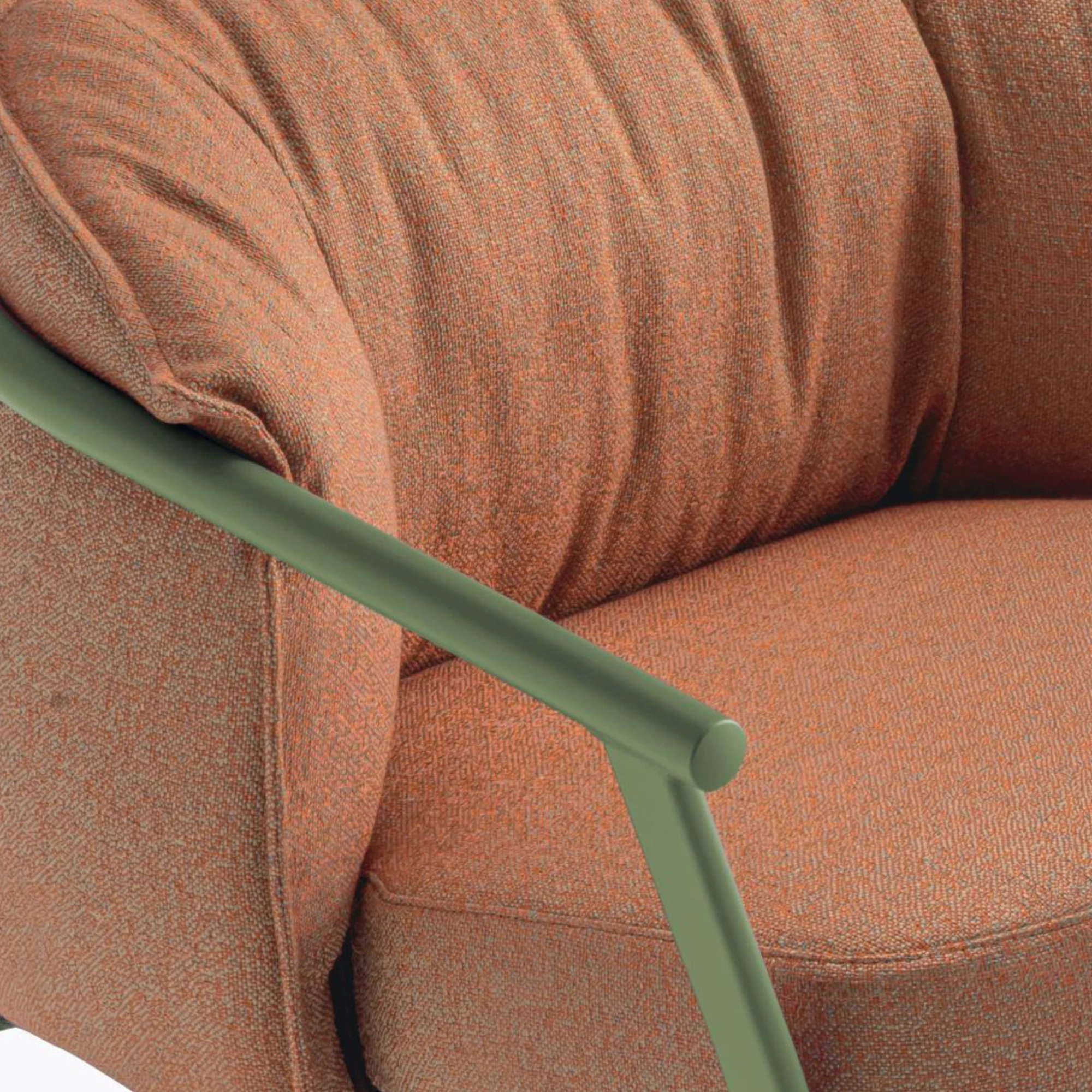 O canapea cu două locuri pentru exterior, construit în jurul unui contrast fermecător: o structură sobră, atent definită, îmbrățișând o pernă moale, generoasă și profund confortabilă. Structura din aluminiu extrudat, cu picioare ovale sudate armonios de cotierele rotunjite, creează o siluetă stabilă și rafinată.