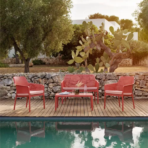 Net Relax este fotoliul perfect ce îmbină confortul, eleganța și durabilitatea pentru spațiile HoReCa. Realizat din polipropilenă cu fibră de sticlă și finisaj mat, dispune de picioare antiderapante și design stivuibil pentru depozitare eficientă. Rezistent la intemperii și raze UV, este ideal pentru utilizare intensivă în aer liber. Disponibil în culorile cadrului: Alb, Antracit, Salice, Tortora, Senape, Coral și cu perne din spumă poliuretanică (densitate 28 kg/m³) în nuanțe Grey Stone, Rosa Quarzo, Senape, Denim, The Verde, Sardinia, Alb sau Gri. Creat pentru terase de restaurante, cafenele și bistrouri ce caută un aspect rafinat și rezistență de lungă durată.