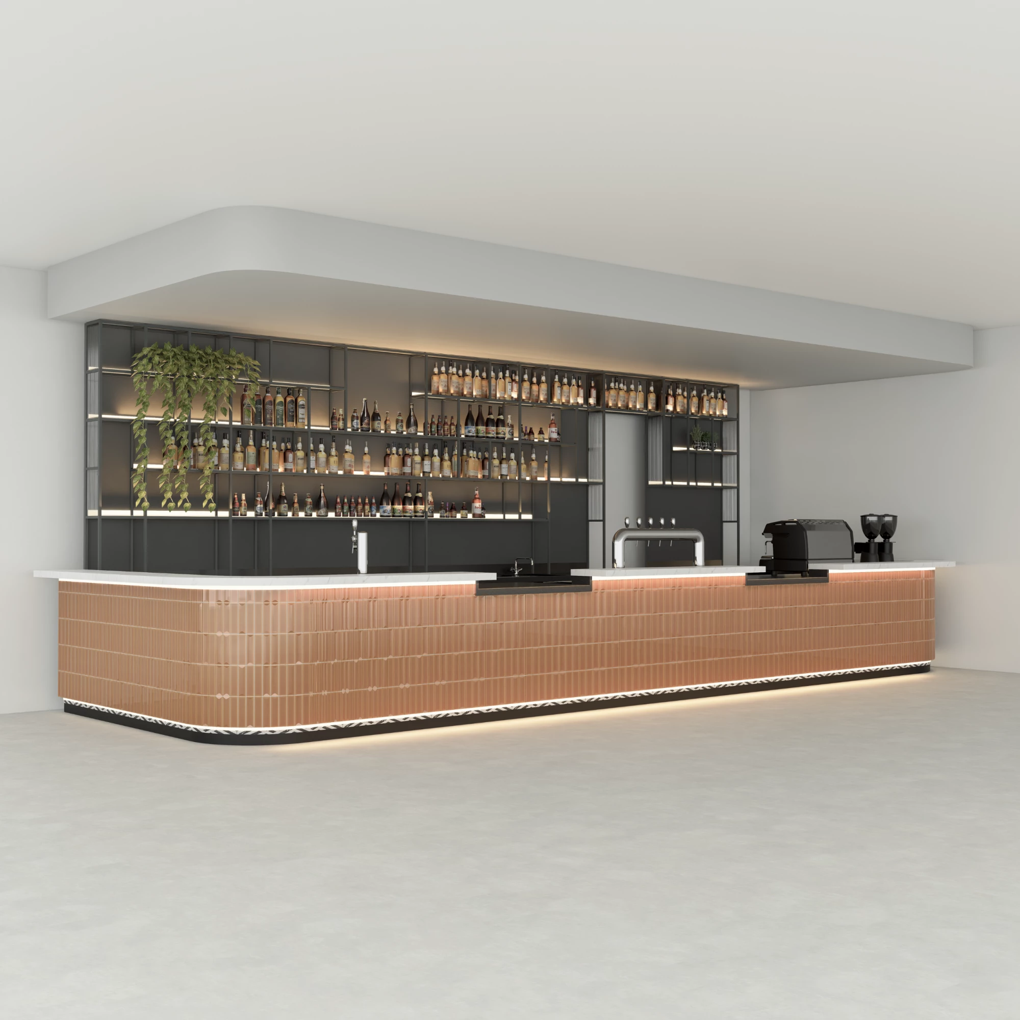 A refined contemporary bar concept designed with soft tones, elegant textures, and a gentle sense of warmth. The service top is crafted in a Carrara-coloured solid surface, offering a clean, luxurious marble-inspired aesthetic. Its calm white veining sets a serene, inviting mood from the very first glance.