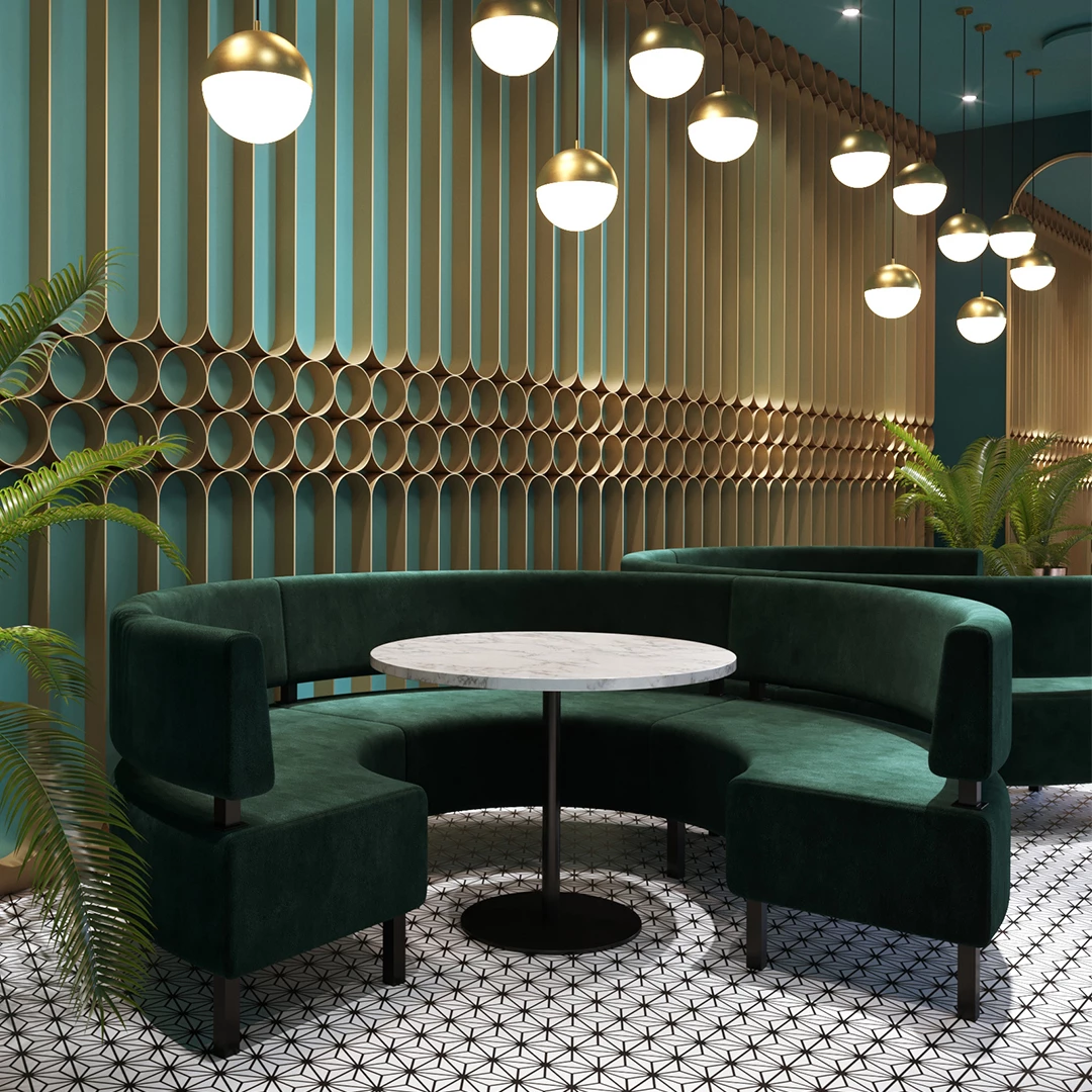 Banca Rado Semicirculară este soluția ideală pentru amenajări elegante în restaurante, cafenele și bistrouri. Cu un design curbat spectaculos, această bancă creează spații dinamice și prietenoase, perfecte pentru conversații și relaxare. Ideală pentru colțuri, lounge-uri centrale sau amplasări de-a lungul peretelui, Rado adaugă un plus de rafinament fiecărui spațiu HoReCa. Tapițată cu materiale premium și construită pe un cadru solid din lemn de fag, oferă durabilitate și confort de top. Rado transformă orice locație într-un spațiu elegant și primitor.