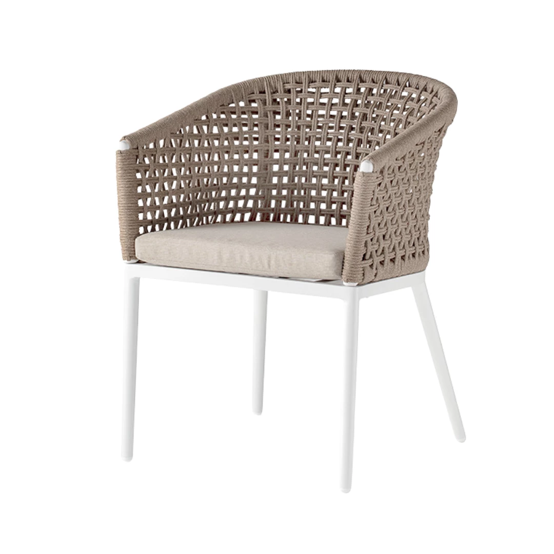 Scaunul Santiago combină designul contemporan cu funcționalitatea. Cadrul din aluminiu este împletit cu frânghie de poliester, în ton cu cele mai noi tendințe. Cu o pernă tapițată din acril rezistent, este ideal atât pentru interior, cât și pentru terase horeca.