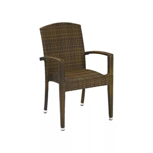 Titus Brown A este un scaun de exterior cu brațe, realizat din aluminiu vopsit în câmp electrostatic și șezut/spătar din P.E.-Wicker plat, culoare burnt. Rezistent la UV și intemperii, poate fi stivuit până la 8 bucăți. Potrivit pentru orice spațiu horeca exterior. Disponibil cu pernă opțională pentru un plus de confort.