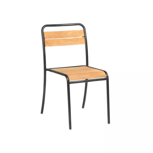 Acest elegant scaun de terasă pentru exterior combină un cadru metalic robust cu frumusețea naturală a lemnului de castan, oferind un echilibru perfect între durabilitate și design. Structura este proiectată special pentru a rezista condițiilor din exterior, fiind ideal pentru terasele restaurantelor, cafenelele în aer liber și spațiile HoReCa. Scaunul este disponibil într-o gamă variată de culori RAL, ceea ce permite adaptarea la identitatea vizuală a oricărui brand. Cu un design atrăgător și o construcție rezistentă la intemperii, este o alegere practică și estetică pentru utilizarea comercială în aer liber.