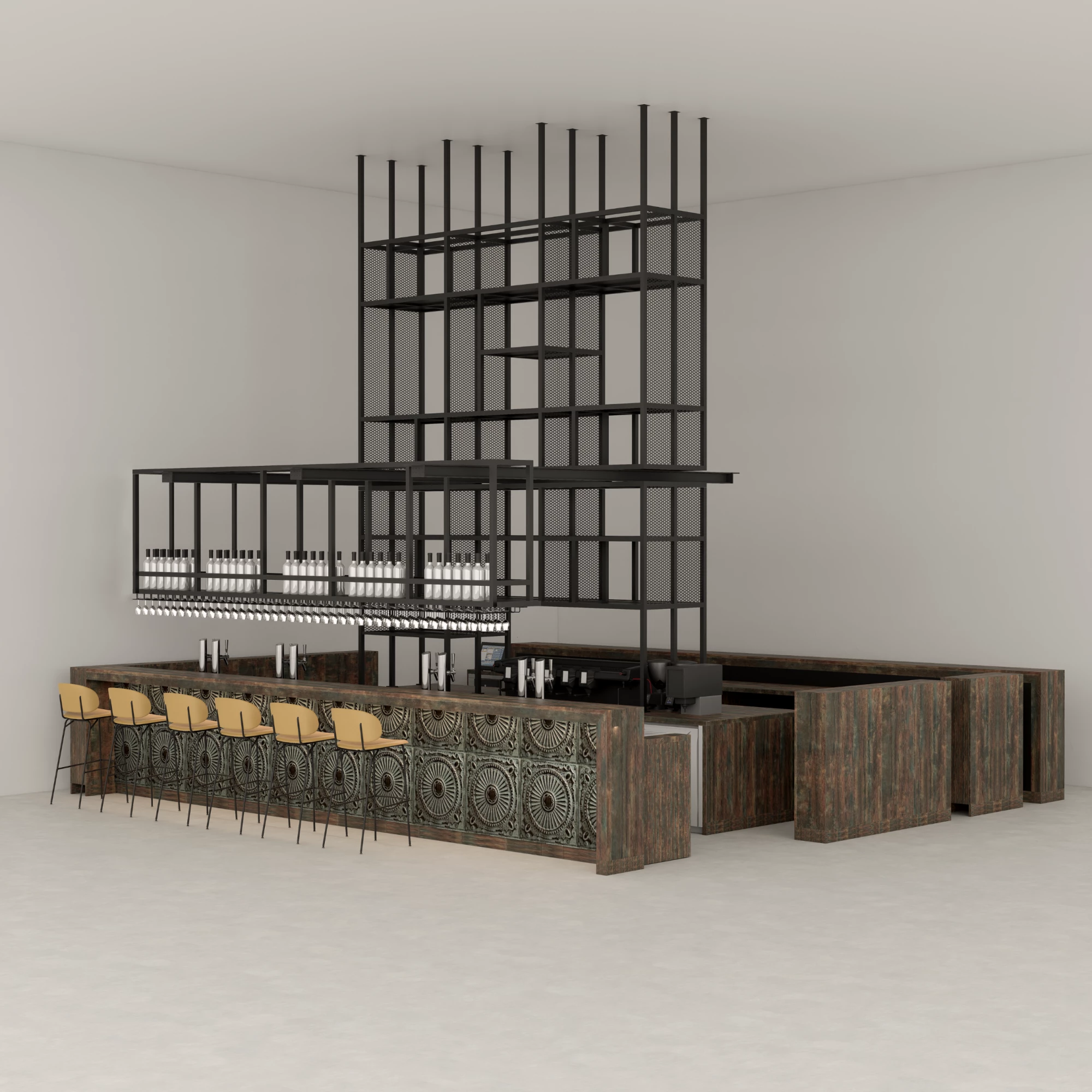 A contemporary bar concept combining rich textures, warm metallics, and sophisticated architectural detailing.