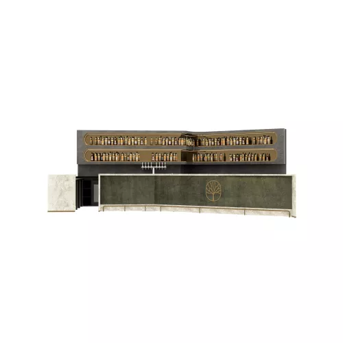 This custom-designed bar showcases a modern, linear layout with a refined stone-effect finish and illuminated shelving. The front counter is highlighted with a decorative emblem, creating a strong visual identity for the space. Behind the bar, floating shelves with integrated lighting provide an elegant display for bottles, combining functionality with striking aesthetics. Ideal for contemporary hospitality concepts, this bar design blends durability, sophistication, and brand character.