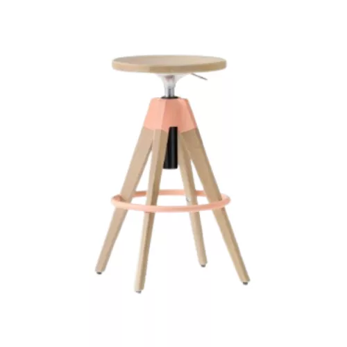 Arki-Stool face parte din colecția Arki, care reinterpretează stilul industrial într-un mod funcțional. Taburetul are șezut și picioare din stejar masiv, un mecanism rotativ și un sistem cu piston pe gaz pentru reglarea ușoară a înălțimii. Suportul pentru picioare din oțel adaugă un contrast elegant față de naturalețea lemnului. Realizat din stejar masiv, cu finisaj mat pe bază de apă, rezistent la zgârieturi, taburetul are o coloană neagră din aluminiu turnat sub presiune, reglabilă pe înălțime. Este prevăzut cu piciorușe din oțel (Ø20 mm) și inserții interschimbabile: tip “15” din fetru pentru suprafețe delicate (lemn, ceramică, marmură), și tip “17” din plastic pentru covoare, mochetă sau suprafețe dure (beton, metal).