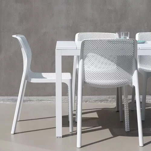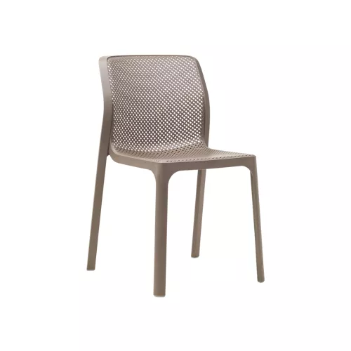 Bit este un scaun monobloc modern pentru exterior, realizat din polipropilenă armată cu fibră de sticlă, colorată uniform și cu aditivi UV. Finisaj mat, material reciclabil și opțiuni variate de culoare – perfect pentru terase HORECA.