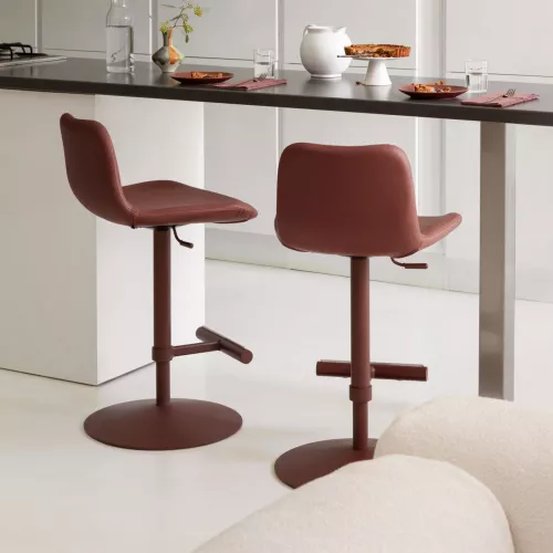 Scaun de bar Dalia SG TS, prevăzut cu bază metalică pivotantă și reglabilă pe înălțime, disponibilă în diverse finisaje. Șezutul este tapițat în țesătură, piele sau imitație de piele, oferind confort și eleganță oricărui spațiu horeca.