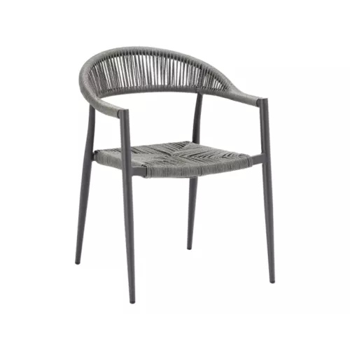 Scaun de exterior realizat din aluminiu și împletitură din frânghie, în conformitate cu cele mai noi tendințe. Este un model stivuibil, ușor de transportat și depozitat în sezonul rece. Forma și materialele îl fac potrivit atât pentru interior, cât și pentru exterior.