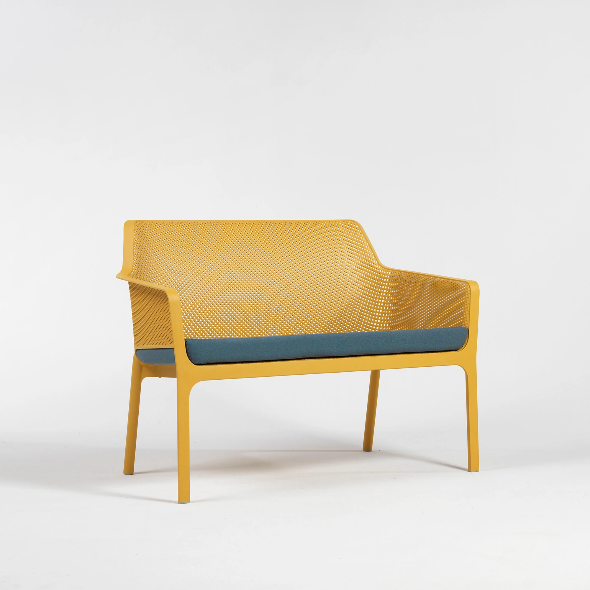Net Bench este o bancheta elegantă și practică, creată pentru performanță ridicată în spațiile comerciale exterioare. Fabricată din polipropilenă cu fibră de sticlă monobloc, cu aditivi UV și finisaj mat rafinat, oferă durabilitate excelentă, rezistență la intemperii și stabilitate a culorii. Dispune de picioare antiderapante și design stivuibil pentru depozitare ușoară. Disponibilă în șase culori elegante pentru cadru—Alb, Antracit, Salice, Tortora, Senape, Coral—poate fi echipată cu pernă din spumă poliuretanică (densitate 28 kg/m³) în nuanțe Grey Stone, Rosa Quarzo, Senape, Denim, The Verde, Sardinia, Alb sau Gri. Complet reciclabilă, ideală pentru terase de restaurante, cafenele și bistrouri ce doresc confort, stil și calitate durabilă.