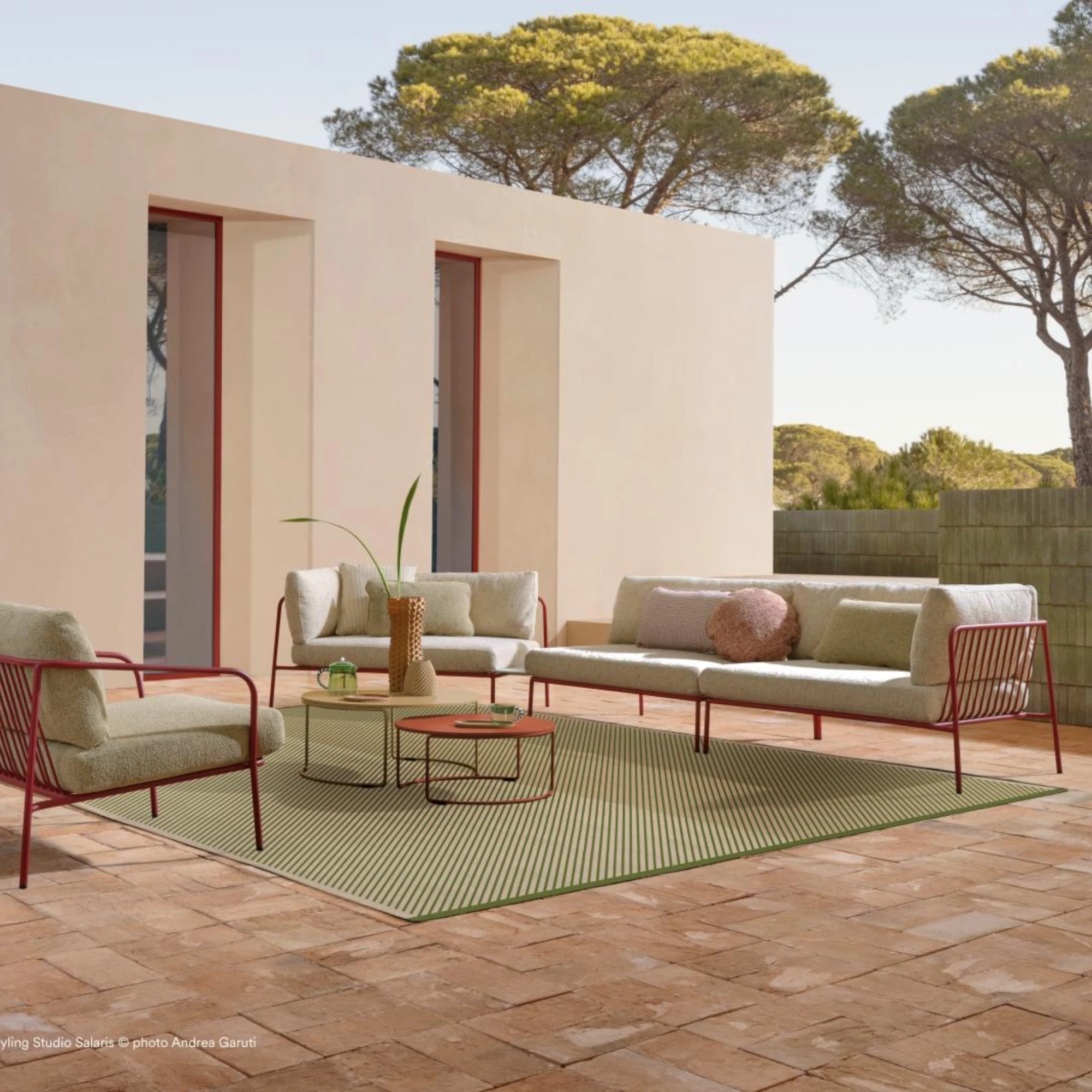 Elementul de colț are o structură din țeavă de oțel vopsită în câmp electrostatic, perfectă pentru utilizarea în exterior. Pernele șezutului, din spumă poliuretanică, și cele ale spătarului, din poliester, sunt protejate de o căptușeală impermeabilă și îmbrăcate în materiale outdoor sau polipropilenă. O pernă laterală poate fi adăugată sau eliminată, în funcție de atmosferă și spațiu.