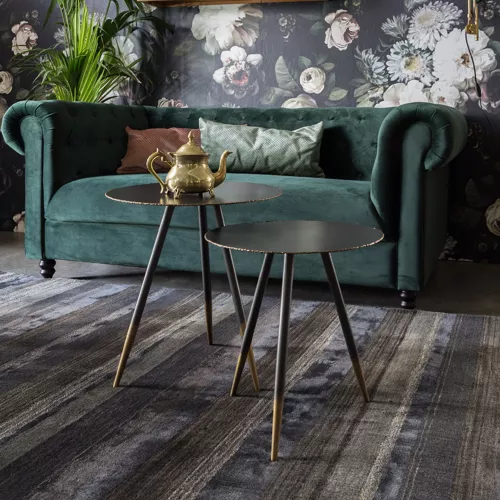 Ostrom Set include două măsuțe metalice care îmbină stilul industrial cu eleganța rafinată. Blatul din fier acoperit cu pulbere gunmetal (3 mm) are margini sudate aurii, pentru un efect vizual puternic. Picioarele robuste, cu capete aurii, completează designul. Dimensiuni: S – Ø40×44 cm, M – Ø45×50 cm. Ideal pentru spațiile horeca premium.