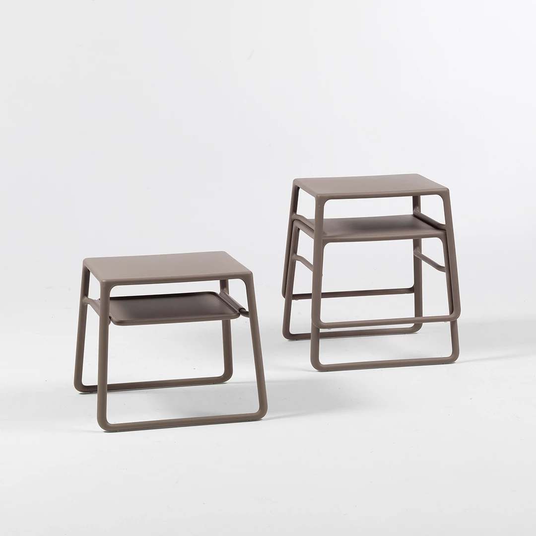 Pops Side Table: cadru durabil din polipropilenă în alb, antracit sau tortora. Elegantă, rezistentă la intemperii, perfectă pentru terase de restaurante, cafenele și bistrouri. Ușor de întreținut, ideală pentru spații comerciale exterioare.