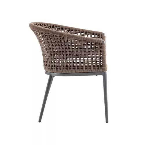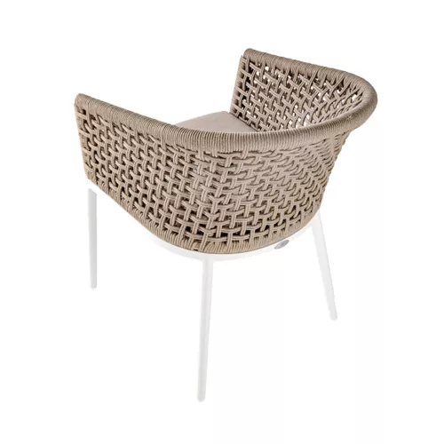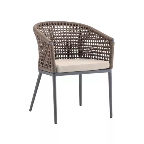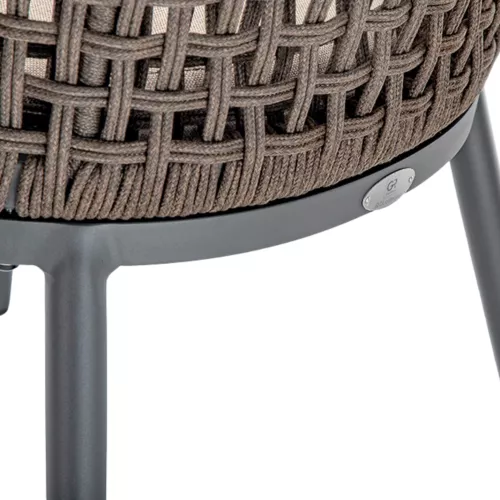 Scaunul Santiago combină designul contemporan cu funcționalitatea. Cadrul din aluminiu este împletit cu frânghie de poliester, în ton cu cele mai noi tendințe. Cu o pernă tapițată din acril rezistent, este ideal atât pentru interior, cât și pentru terase horeca.